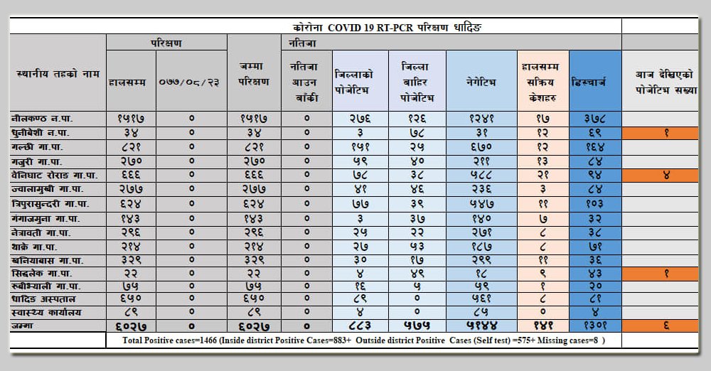 धादिङमा कोरोना संक्रमित संख्या १४ सय ६६ पुग्यो, आज ६ जना थपिए