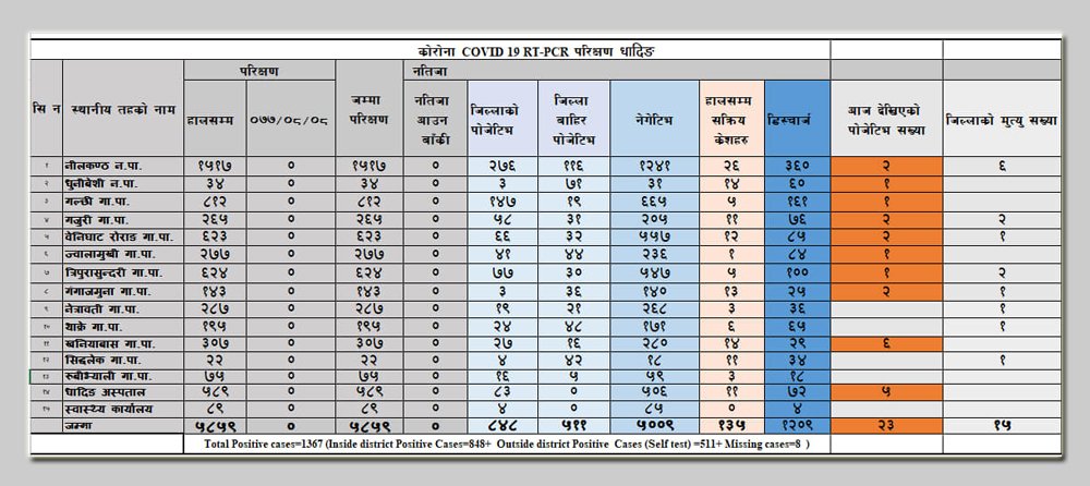 धादिङमा कोरोना संक्रमितको संख्या १२८२ जना पुग्यो, आज १४ थपिए