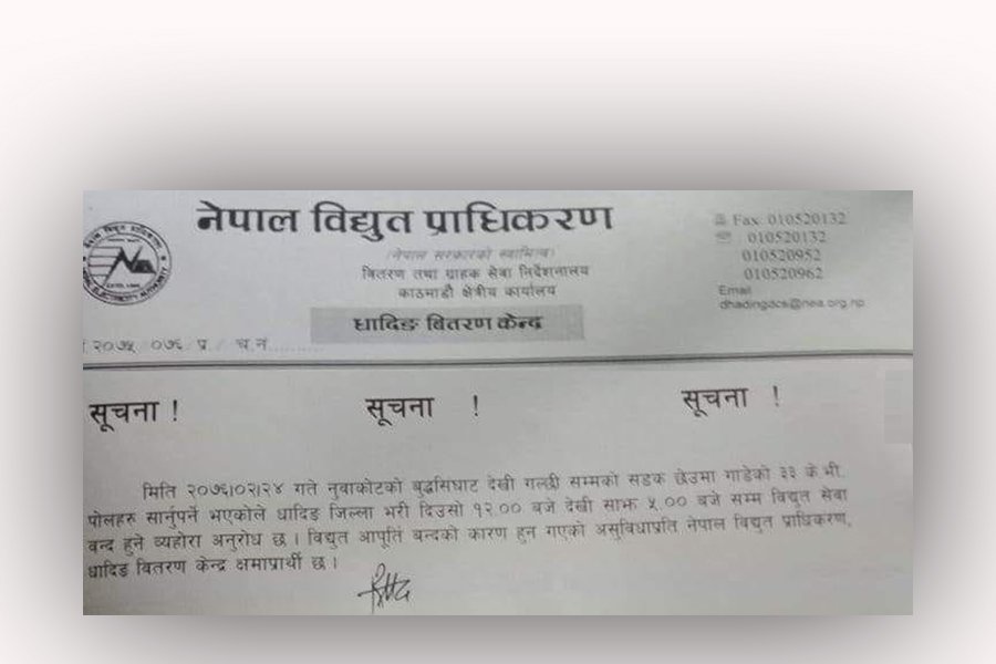 धादिङ जिल्ला भर जेष्ठ २४ गते विद्युत बन्द