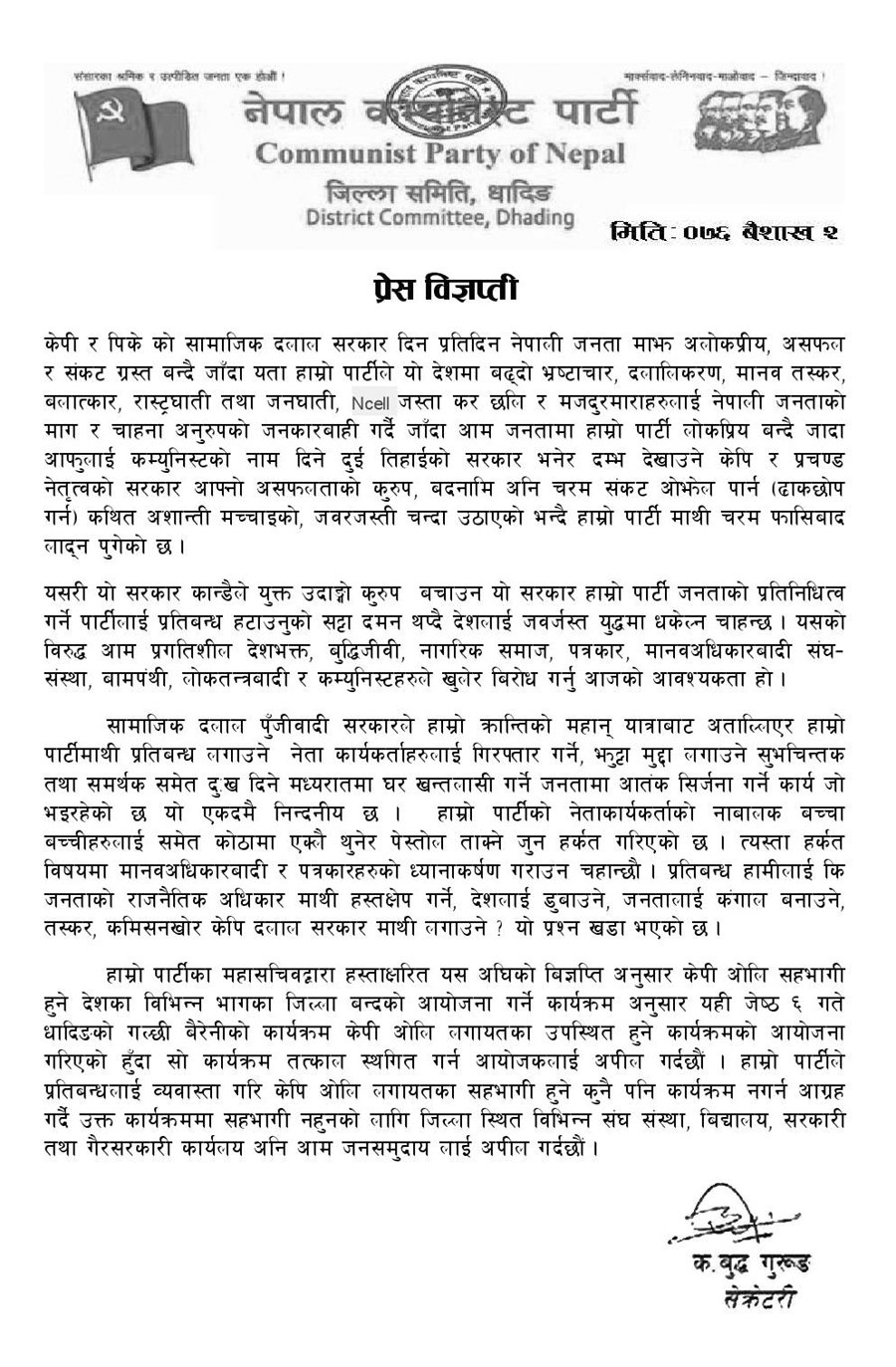 नेकपाद्वारा जेष्ठ ६ गते धादिङ बन्दको आव्हान