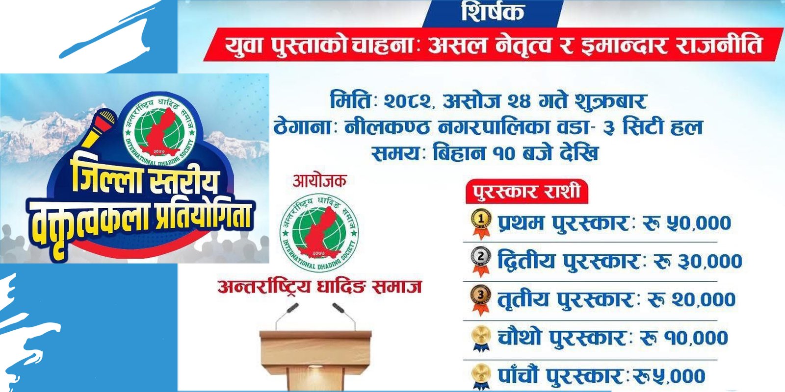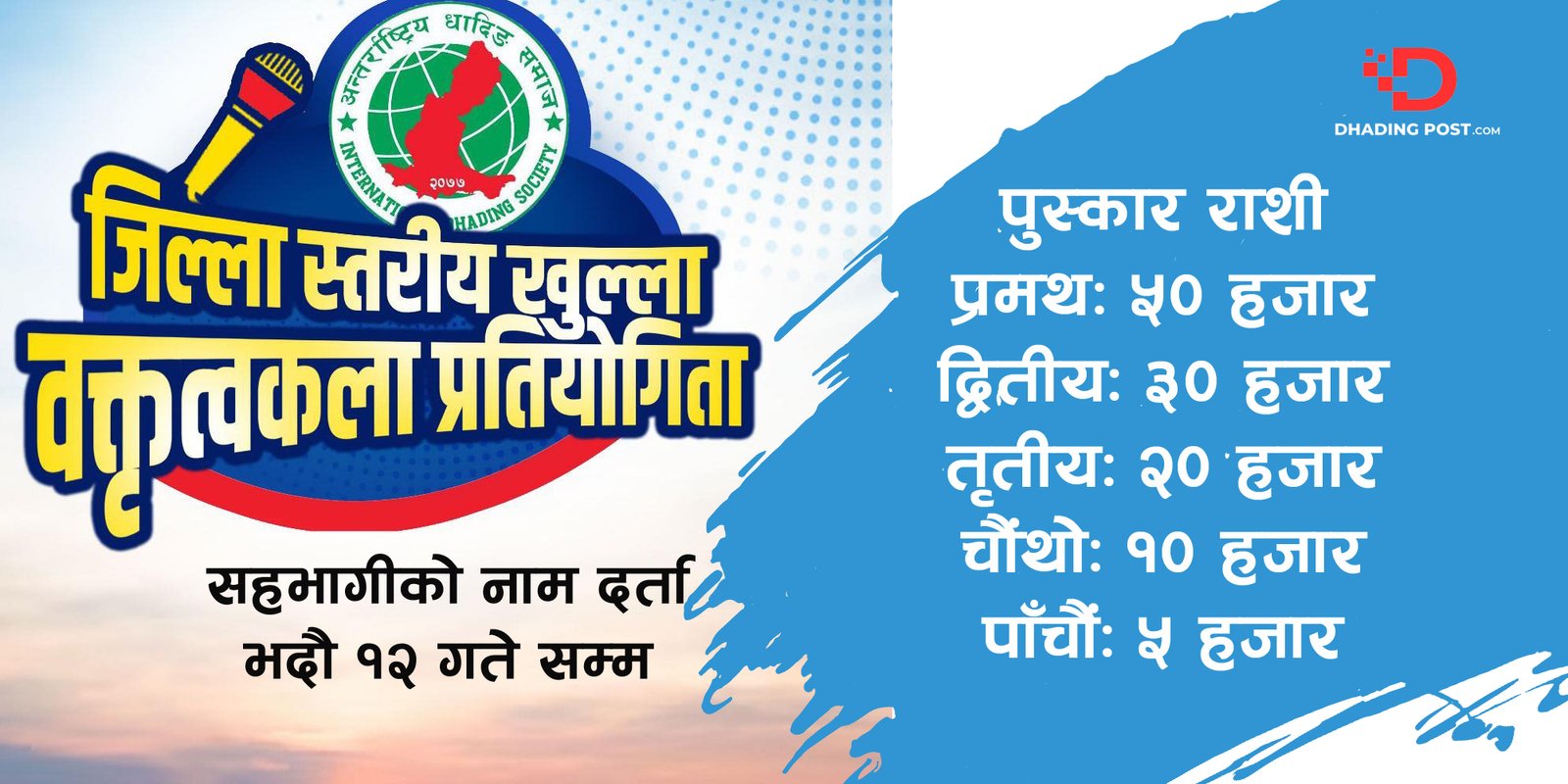 अन्तर्राष्ट्रिय धादिङ समाजद्वारा असोज २४ गते जिल्ला स्तरीय वक्तृत्वकला प्रतियोगिता हुने
